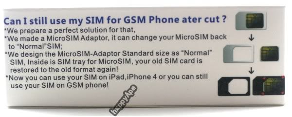 Features:Convert your standard sim card (15 x 25mm) to a micro sim card (12 x 15mm) with this special micro sim cutter.Use this micro sim card cutter to convert your standard sim card to a micro sim card to be used with iPhone 4G / iPad and many other devices. Without this cutter, you need to cut the sim card by yourself, which will often result in a broken sim card.