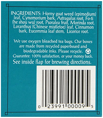 -. Binding : Health and Beauty -. Brand : Triple Leaf Tea -. Feature : Renowned in China for thousands of years as a yang-supporting herb for both men and women / Made in the traditional manner by combining horny goat weed with other Chinese herbs / This blend of herbs was used for nourishing, sustaining and building the chi / Traditional, time tested way to use these valuable herbs, brewed as a tea / Horny goat weed contains many bioflavonoids -. Label : Triple Leaf -. Manufacturer : Triple Leaf -. MPN : 00009-5 -. PartNumber : 00009-5 -. ProductGroup : Health and Beauty -. ProductTypeName : HEALTH_PERSONAL_CARE -. Publisher : Triple Leaf -. Studio : Triple Leaf -. Title : Triple Leaf Tea Bags, Horny Goat Weed, 20 Count