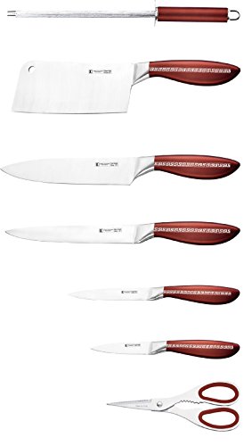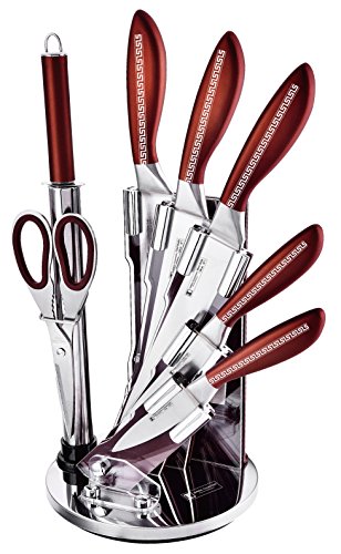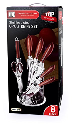 Imperial Collection Stainless Steel Kitchen Cutlery Knife Set with Rotating Acrylic Stand, 8-Piece (Wine Red)