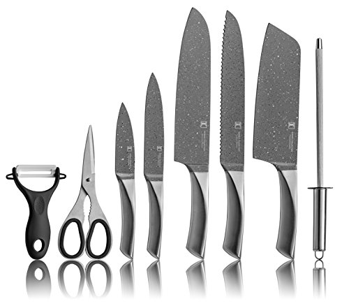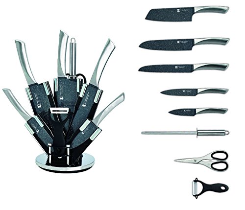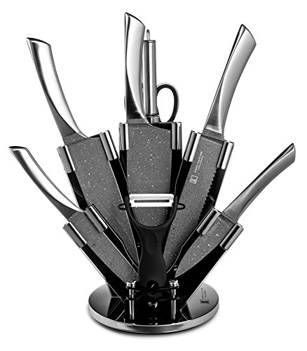 Imperial Collection Stainless Steel Kitchen Cutlery Knife Set with Rotating Acrylic Stand and Non-Stick Granite Coating, 9-Piece (Silver Granite)