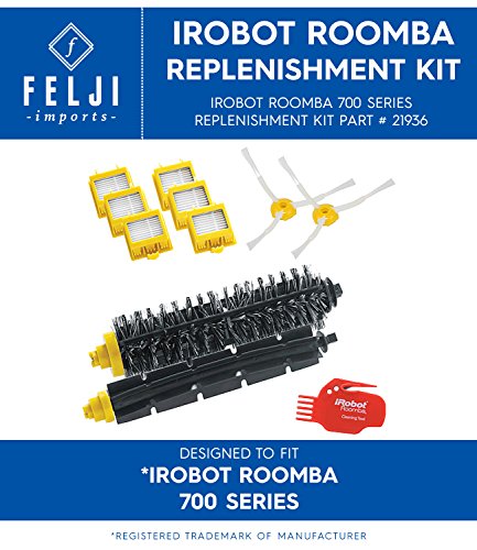 -. Feature : Contains everything you need to help maintain your robot's cleaning performance in one convenient kit / Kit includes 1 bristle brush, 1 flexible beater brush, 2 spinning side brushes, 3 sets of filters, and 1 brush cleaning tool / Compatible with Roomba 700 Series Robots / Designed & Engineered By Felji
