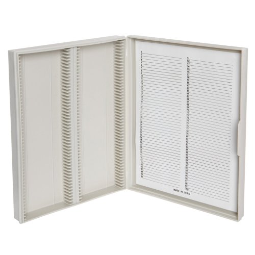 The Dyn-A-Med 63000 microscope slide storage box holds 100 slides and has numbered slide positions and a numbered contents sheet to list the slides in the box. The hinged-lid box is made of polypropylene for durability and holds 25 x 75mm (1 x 3") microscope slides (sold separately).