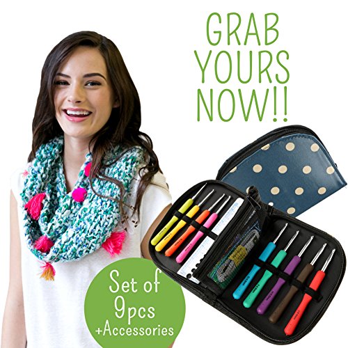 Mom's Crochet Hooks| 9Pcs Multiuse Ergonomic Crochet Hook Set and Accessories for Knitting | Soft Grip TPR Handles with Aluminum Needles | Ideal for Gift with Carrying Case | Various Color | 54.7