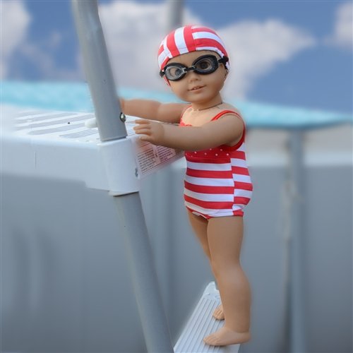 -. Feature : Swim Wear Set for Doll made to fit 18 Inch dolls such as American Girl, Madame Alexander, Our Generation, etc. / Includes Doll Swim Suit, towel, goggles and swim cap / 18 Inch Doll Swimsuit with lively stripes, polka dots and bow accent / Swim Outfit for 18 Inch Dolls with all accessories needed for a fun day at the beach / Made by The New York Doll Collection, offering the highest quality 18" Doll Furniture, 18" Doll Clothes, 18" Doll Shoes and 18" Doll Accessories!