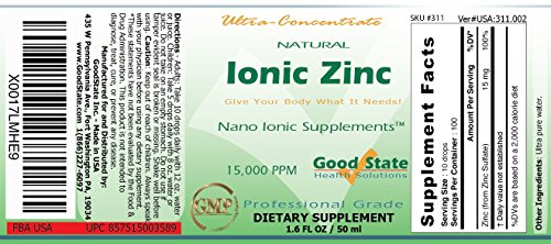 -. Binding : Health and Beauty -. Brand : Good State -. Color : Glass -. EAN : 0857515003923 -. Feature : Same Great Ionic Zinc from Good State - Now in a Glass Bottle! / Absorbs much better than pills! / Only 10 drops equals 15 mg of Ionic Zinc - 100 total servings / Small size - very convenient for travel - Comes with dropper! / Easy to mix with juice or water. Can be taken sublingually. -. IsAdultProduct : 0 -. Label : Good State -. Manufacturer : Good State -. MPN : Parent -. PackageQuantity : 1 -. PartNumber : Parent -. ProductGroup : Health and Beauty -. ProductTypeName : HEALTH_PERSONAL_CARE -. Publisher : Good State -. Studio : Good State -. Title : (Glass Bottle) Good State Liquid Ionic Zinc Ultra Concentrate (10 drops equals 15mg - 100 servings per bottle) -. UPC : 857515003923