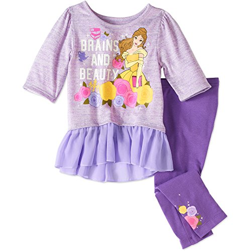 Disney Belle Toddler Girls' Legging Set: Your little one will love the style and comfort of this Disney Belle Toddler Girls' Legging Set. Both a quarter-sleeve top and a matching pair of leggings are included in the set for great value and convenience. The top has a cute graphic of Beauty and the phrase "brains and beauty" with an elegant set of chiffon trim on the hem, while the pants feature a deep solid purple color, a hassle-free covered elastic waistband and a tapered-leg design that will add an adorable silhouette. This outfit set is available in purple and works in all sorts of casual warm-weather situations. Upper: 95% polyester, 5% spandex Skirt: 100% polyester Leggings: 58% cotton, 38% polyester, 4% spandex 2-piece outfit setFeature