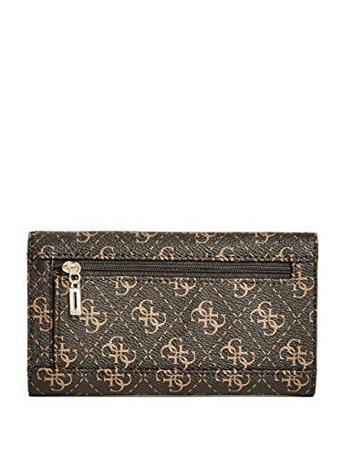 Front logo plaque. Fold-over flap with snap-button closure. Tri-fold design.