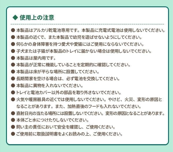 | 規則正しい時間に5食分のお食事や薬を提供することができます。1度目のお食事はすぐに食べられるお食事で、残りの4食はご希望の時間に設定することができます。トレイは取り外して洗うことができますので、清潔にお使いいただけます。各トレーには約100gずつのフードを入れることができます。ご使用には単1アルカリ乾電池4本(別売)が必要です。 |