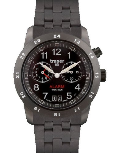 A great watch that incorporates 2 functions; big date and alarm. The big date is nicely positioned at 6:00 on this model. If also features a handy alarm function, a Ronda 4120.B alarm quartz movement, seconds subdial at 9:00 position, a scratch resistant sapphire crystal, brilliant blue illumination, stealth black PVD coated case and bracelet, a screwed-in case back, a 24 hour labeled bezel, and easy to read white on black sub-dials. Case: Black PVD coated steel, 40mm diameter. Band: Black PVD coated steel with a deployant closure. Water Resistant: 10 ATM. Warranty: 3 Years (10 years on the illumination).
