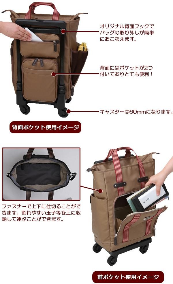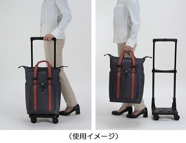 | 仕様 | ●バッグ最大積載量:15kg ●容量:約23L ●ハンドル高:6段階(90cm、85cm、80cm、75cm、70cm、65cm) ●持ち手立ち上がり:約11cm ●60mm交換式キャスター(特許:第4286155号) ●オリジナル背面フック ●アウトフレーム ●バッグ単体使用可 ●撥水加工 ●B4収納サイズ ●コインロッカーサイズ ●日本国内線機内持ち込み:100席以上可 |
