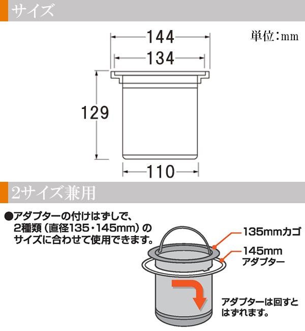 アダプターの付けはずしで、2種類(直径135mm・145mm)のサイズに合わせて使用できます。