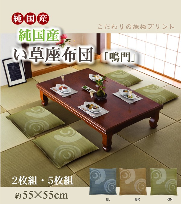 【商品名】純国産 捺染 い草座布団 『鳴門 2枚組』 ブルー 55×55cm×2P