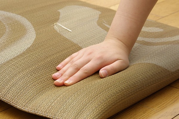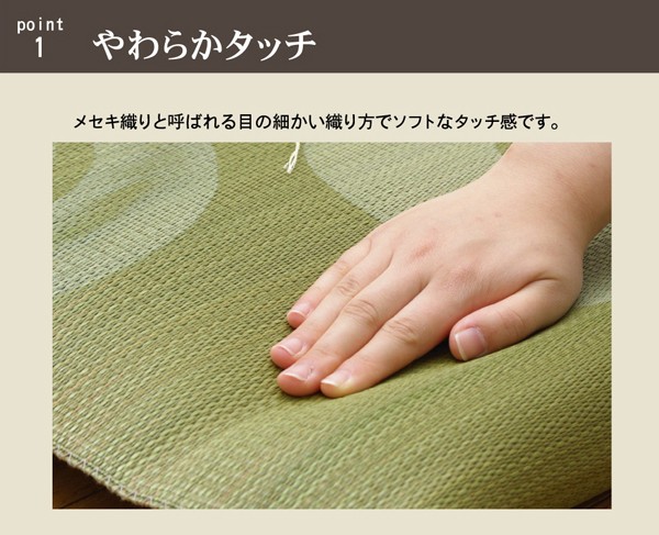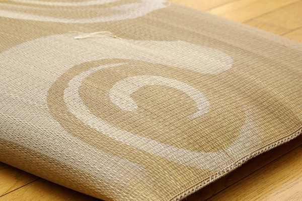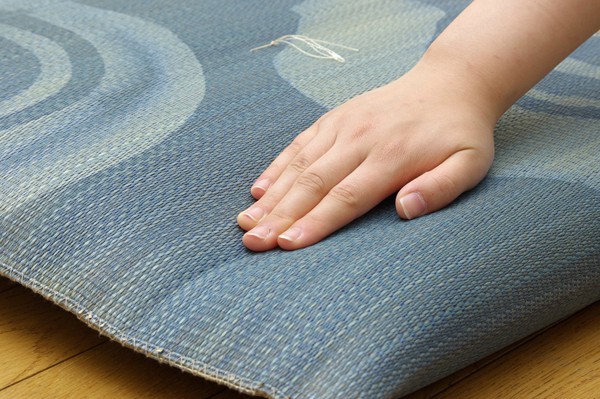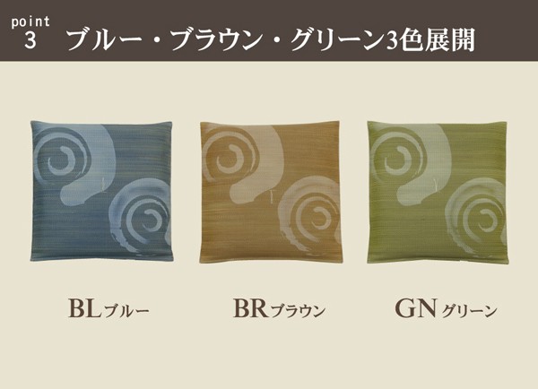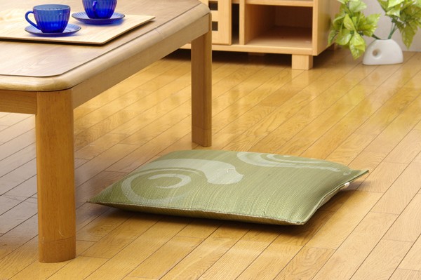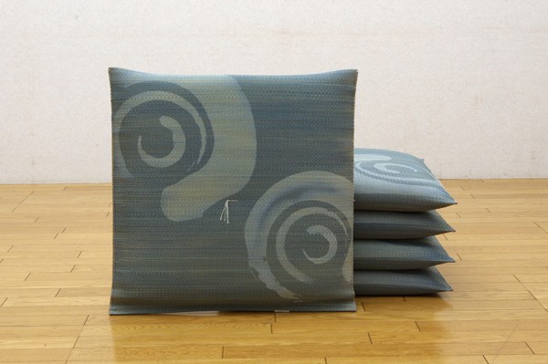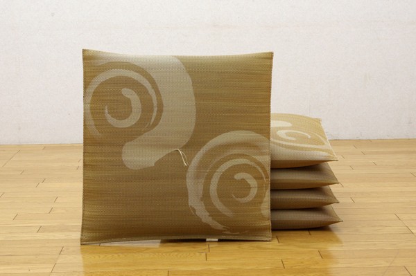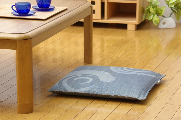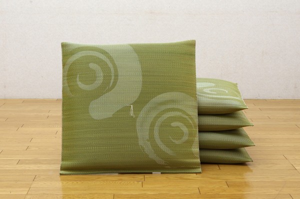 職人が1枚1枚手作業で捺染プリントを施したイ草座布団です。生地にはメセキ織りと呼ばれる織りを採用し、柔らかくさらっとした肌触りに仕上げました。国産(九州産)のい草を使用しています。一本一本が太く、表皮が厚く繊維がキメ細かいので弾力性があり、耐久性に優れています。い草には空気の自然浄化作用、湿度の調節作用などがあります。また汚れにくく、使用するうちに黄金色に変化し味が出ます。い草に青森ヒバ加工を施しています(抗菌、防臭効果)。※柄のプリントは職人が手作業で描く為、同じ色・柄であっても多少風合いが異なります。