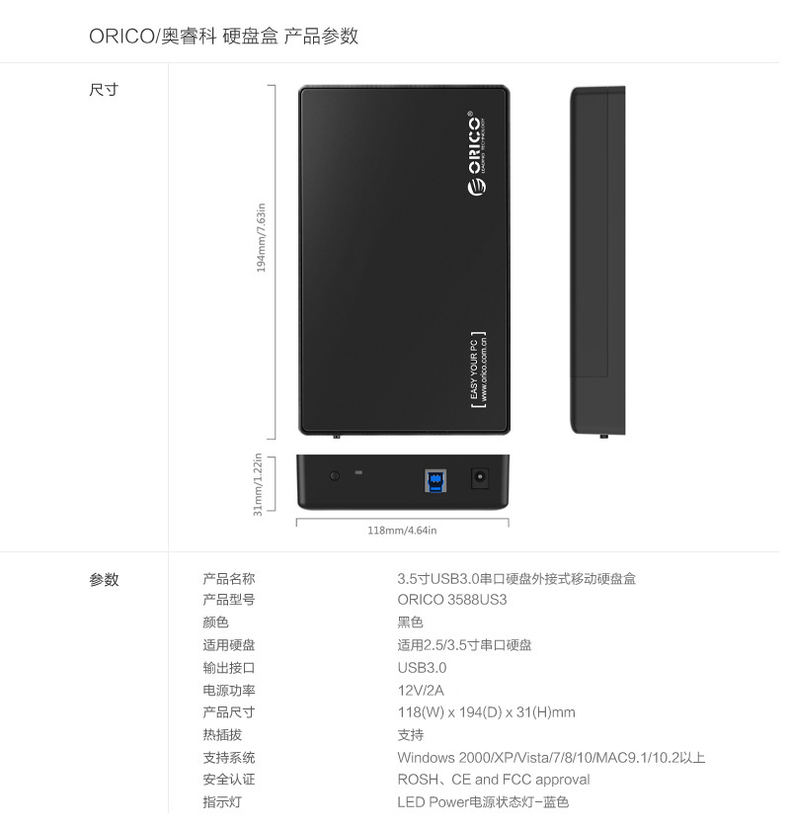 旧宅焕新颜:ORICO 奥睿科 3588US3-BK 3.5寸台式机SATA串口 USB3.0移动硬盘盒