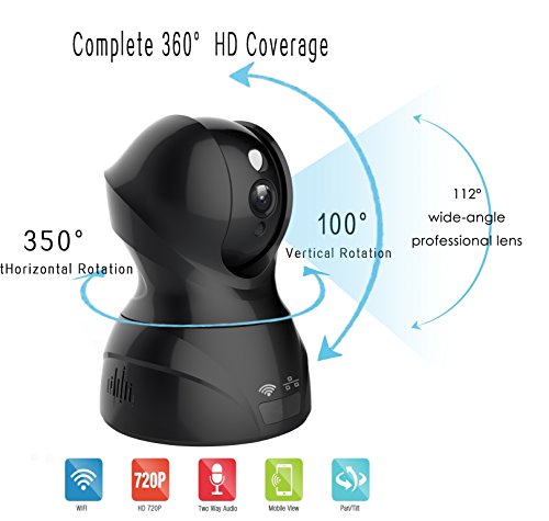 BASICS: 720p High-definition, advanced glass lens combined with 350° horizontal & 100° vertical rotation range create a complete 360° coverage. Motion Detection with snapshot alert notification, built-in speaker and mic for real-time hands-free Two-Way audio ( both parties talk and listen freely for maximum flexibility ). Advanced night vision with High Power Dot matrix infrared light extend the viewing distance to 10 meters in pitch dark with no light pollution.