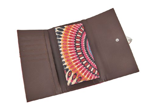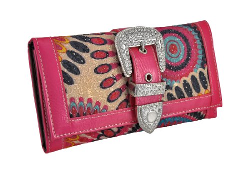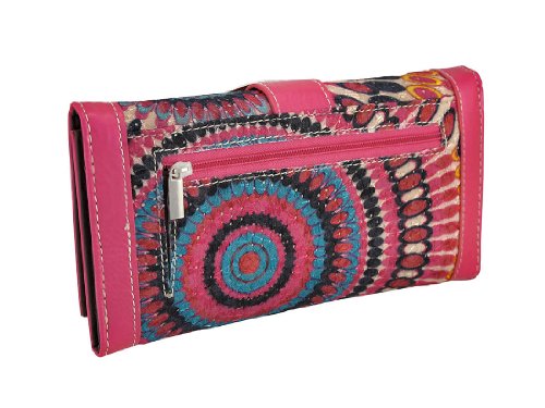 Studio : Zeckos Publisher : Zeckos Product Description This nylon canvas wallet features a Bohemian style circle tie dye print, hot pink vinyl trim, and a sparkling rhinestone buckle. It measures 7 1/2 inches long, 4 inches tall, and secures with a snap. The wallet opens up to reveal 11 credit card slots, a window view ID slot, a removable checkbook cover, and 4 slip pockets for cash, receipts, and business cards. There is also a zipper compartment on the back of the wallet for loose change. It is sure to be admired, and makes a great gift for a friend. 0