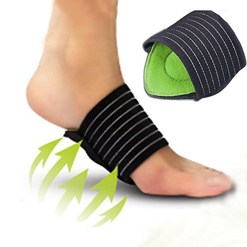 -. Feature : Arch Support Pads Breathable material lets your foot breathe and prevents bad odors and perspiration / Provide extra consistent compression across the arch of your foot to help reduce heel and arch pain associated with plantar fasciitis and other foot issues such as spurs. / Good cushion for running, walking, hiking standing or if you are on your feet all day. / Stays in place comfortable, thanks to an unique elastic strap that goes across the top of the foot, which means you can wear them discretely with or without socks / One Size Fits Men, Women and Older Kids. Each pad can be worn on either foot. Wear with any shoe, sneakers, sandals or barefeet.