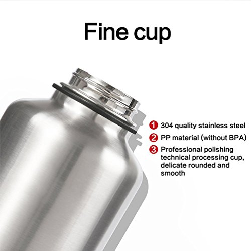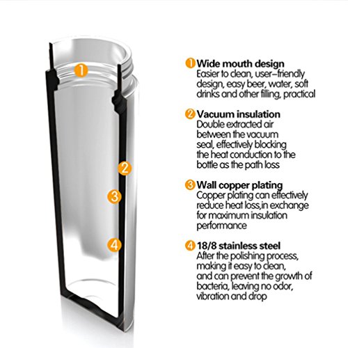 -. Feature : The seal is very tight:Double wall construction keeps beverages cold for up to 18 hours and warm for up to 12 hours / Large bottle mouth is more convenient for cleaning Sturdy, Durable Quality / Snug Insulation- 2 layers of insulation to maintain your drink's temperature no matter the outside climate. / Material Health and Safety:Made from durable BPA-Free stainless steel keeping your drink free of odor and unwanted taste. Fits most cup holders! / Wide opening provides easy drinking and carrying when traveling, at the gym, outdoors activity ie. Hiking, Mountain Climbling, Running, Biking, Swimming, etc. Perfect even for use at Home or office settings when you just want your drink kept at a certain temperature.