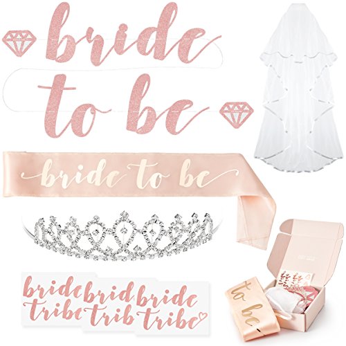 Rose Gold Pink Bachelorette Party Decorations Kit - Bridal Shower Supplies | Bride to Be Sash, Rhinestone Tiara, Pre-Strung Banner, Veil + Bride Tribe Flash Tattoos
