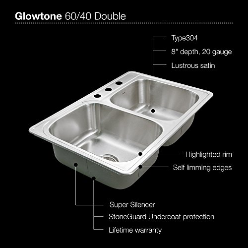 Houzer ISL-3322BS3-1 Glowtone Series Topmount Stainless Steel 3-hole 60/40 Double Bowl Kitchen Sink