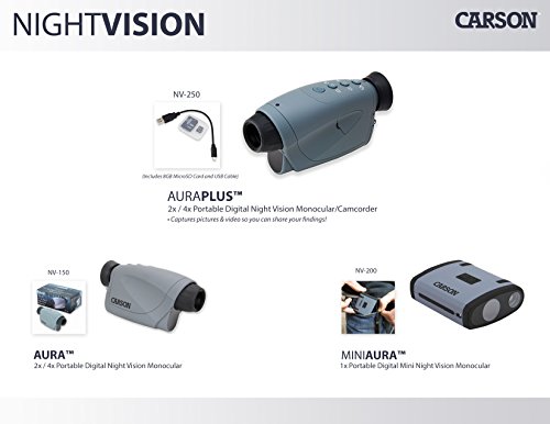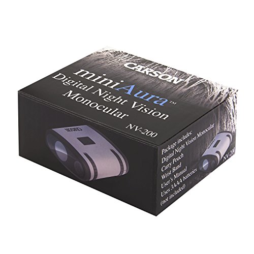 Say goodbye to night vision devices with image intensifier tubes that burnout over time. The Mini Aura from Carson Optical is a completely digital night vision monocular that won't burn out. The images seen through the digital screen will no longer be green but rather in a crisp black and white. The intensity can be easily adjusted with a simple push of a button. It boasts a 19-degree angle of view and you can see up to 82 feet in total darkness. The Mini Aura is compact and lightweight and can even fit in your pocket allowing you to bring it almost anywhere. Use the Mini Aura on camping trips for late night wildlife viewing, at dusk during hunting trips or during any outdoor activity. It can be used in ambient light or total darkness. The Mini Aura comes with a carry pouch and wristband. It uses 3 AAA batteries (not included). At Carson, we strive to make sure our customers are 100% satisfied with the quality of our products. We are so confident in our products that we back them with a One Year Limited Warranty! This Carson product is warranted to be free from defects in material and workmanship for a period of one year from date of purchase. Please contact Carson for additional warranty details.Feature