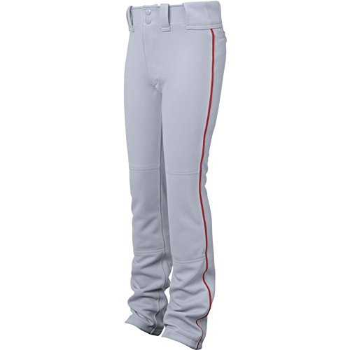 Piped Pro player fit. Tunnel-belt-loop waist. Fly front with extended two-snap closure. Two set-in back pockets with button closure. Double knee. Hemmed bottom.
