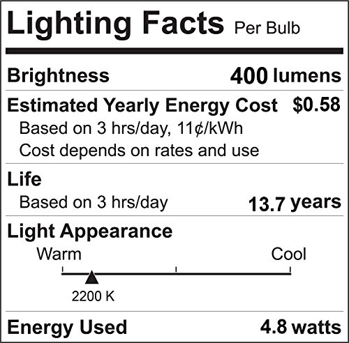 - Estimated yearly energy cost: $0.58 per bulb (based on 3 hours/day, 11 cents/kWh, cost depend on rates and usage)