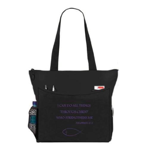 -. Binding : Office Product -. Brand : Christian Crafts -. Color : Black -. Feature : I Can Do All Things Through Christ Philippians 4:13 zippered main compartment bag / Features vibrant one sided printing, extra deep full width front slip pocket / Side mesh water storage pocket, spacious interior and convenenient pen and business card pockets / This terrific bag is made of 600D Polyester, 17"wide x 14"high x 5"deep, with shoulder length handles / Wonderful way to display your faith or give as a gift item. Brand new, top quality product -. Label : Atchison -. Manufacturer : Atchison -. Model : Tote AP8400 Phil Blk/Pur/Fish -. MPN : Tote AP8400 Phil Blk/Pur/Fish -. PackageQuantity : 1 -. PartNumber : Tote AP8400 Phil Blk/Pur/Fish -. ProductGroup : Office Product -. ProductTypeName : OFFICE_PRODUCTS -. Publisher : Atchison -. Size : 17"wide x 14"high x 5"deep -. Studio : Atchison -. Title : Philippians 4:13 I Can Do All Things Through Christ Tote Bag Christian Fish Bible Cover Verse Church Office School Travel Gym Book Organizer - Purple Black