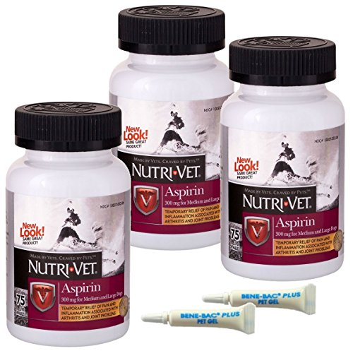 Nutri-Vet® K-9 Aspirin 300mg Chewables for Large Dogs aid in the temporary relief of minor pain & inflammation in your dog. These liver flavored chewables are easy to feed and less upsetting to your dog's stomach. Aspirin is usually the first pain relief choice for dogs. These tablets can reduce pain & inflammation due to aging and sore & arthritic joints. Please read all label instructions before administering to insure proper dosage. Aspirin are NOT intended for cats as cats have trouble metabolizing aspirin. Not intended for human use. Made in the USA.Feature