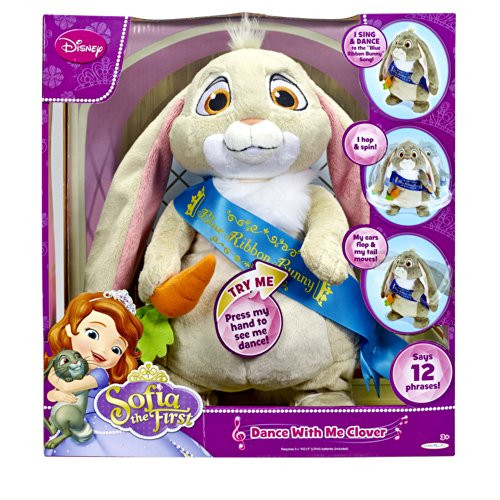 -. Binding : Toy -. Brand : Sofia the First -. EAN : 0039897756028 -. Feature : Sofia the First was excited when her friend Clover won the Blue Ribbon grand prize for his dance performance in the pet contest / Now you can learn Clover's famous dance moves with Dance With Me Clover and see him hop, spin, flap his ears and wag his tail / Press his left hand and watch as he sings and dances to the "Blue Ribbon Bunny" song / Press his right hand and let Clover teach you his famous dance moves step-by-step / 4 AA batteries included. Ages 3+ -. IsAdultProduct : 0 -. ItemPartNumber : 75602 -. Label : Jakks -. Manufacturer : Jakks -. Model : 75602 -. MPN : 75602 -. NumberOfItems : 1 -. PackageQuantity : 1 -. PartNumber : 75602 -. ProductGroup : Toy -. ProductTypeName : TOYS_AND_GAMES -. Publisher : Jakks -. Studio : Jakks -. Title : Sofia the First Dancing Blue Ribbon Bunny Plush -. UPC : 616268779093 -. Warranty : No Warranty