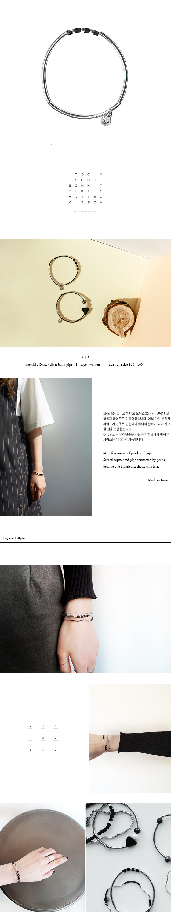 - 주문시 유의사항 : 베리송크(varisonc) 제품으로만 50,000원 이상 구매시 배송비 무료 (배송비 3,000원/도서산간지역 도선료 추가) 줄자, 종이, 끈 등을 활용하여 팔목 사이즈 측정해보시고, 팔목 사이즈보다 약 5mm 크게 팔찌 사이즈를 선택해주세요. Style 6는 유니크한 네모 오닉스(Onyx), 컷팅된 실버볼과 파이프로 이루어졌습니다. 여러 가지 분절된 파이프가 연결되어 하나의 팔찌가 되어 시크한 선을 연출했습니다.