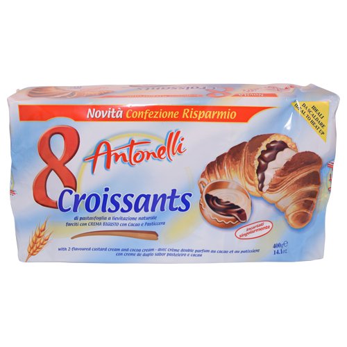 -. Feature : Novelty value pack consisting of 8 delicious cocoa and custard cream filled croissants. / Delicious stuffed sourdough puffy pastries. / Croissants individually wrapped. / Oven baked naturally leavened product. / Product of Italy.