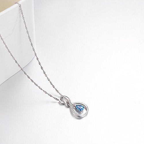 superior quality, 18K white gold plated over sterling silver, this delicate Infinity pendant with pear shaped Natural Gemstone Swiss Blue Topaz & simulated diamond side stones, elegant 20" singpore chain will never let you down.