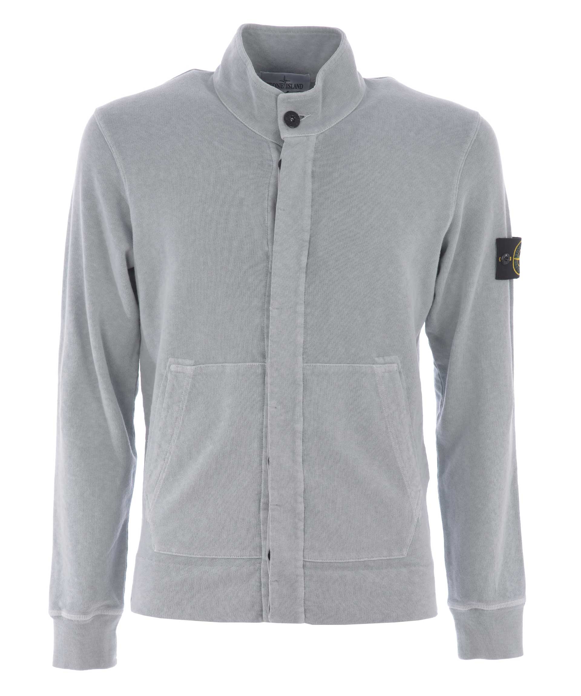 Felpa Stone Island in cotone malfilè Grigio perla effetto old. Collo alto con bottone. Chiusura con bottoni coperti. Tasche frontali. Polsi e fondo a costine. Patch logo in lana sulla manica sinistra, removibile. Misura in foto S 100% cotone
