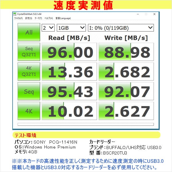 - 読出速度: 95MB/秒、書込速度: 95MB/秒