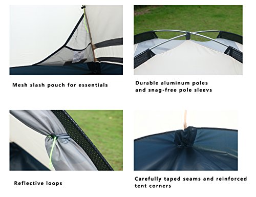 This tent is designed to deliver years'service;TESTED and RELIABLE Water Resistance:FULLY TAPED Rip-Stop rain fly with 3000mm PU coating;TAPED BATHTUBE tent floor and carefully welded corners keeps you and your gear bone dry even in storm rain