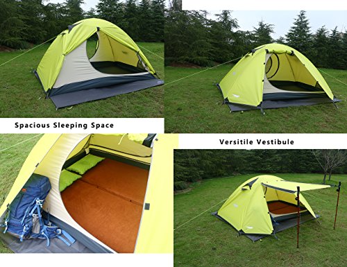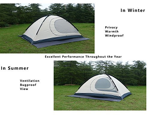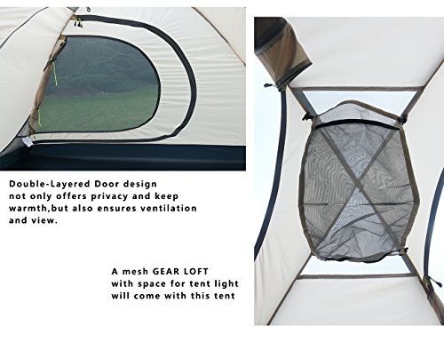 2 VESTIBULES provides ample gear storage space;vestibule doors can be affixed to fully closed or partially open for ventilation and sun shade while maintaining gear coverage; Mesh layer of the doors can be opened ONLY FROM INSIDE ,this feature can stop naughty intruder and offer absolute privacy in wilderness ;Reasonable peak height for abundant headroom to sit straight