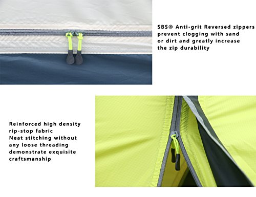 Multi-functional MESH GEAR LOFT not only offering handy storage for essentials,but also helping diffusing the light to create a comfortable and even glow through the whole tent when its empty;REINFORCED TENT CORNERS can sustain constant tension and pulling;SBS?zippers won¡¯t drive you crazy