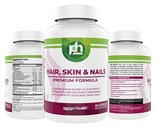 This premium formula contains a unique combination of 13 ingredients consisting of herbs, vitamins, amino acids and minerals specifically designed to help support, nourish and promote the growth of healthy hair, skin and nails. This innovative formula provides you with the vital nutrients your body needs to support your natural beauty from within. Purgo Health Hair Skin and Nails provides you with the vital nutrients your body needs to support your natural beauty from within. Vitamin A assists with skin maintenance and overall health. B vitamins help with energy metabolism. Biotin helps to maintain healthy hair. Vitamins E and C are antioxidants. Vitamin E contributes to skin health and Vitamin C is involved in collagen production and formation, which forms the basis for vibrant skin.Feature