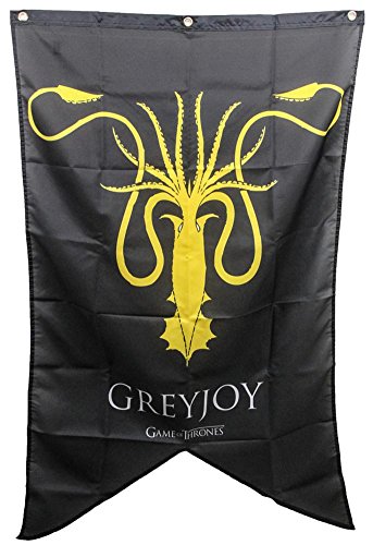 -. Feature : Greyjoy Family Banner - Measures 30" x 50" / Features 3 aluminum grommets on the top edge for easy hanging / Officially licensed Game of Thrones banner/flag / 100% polyester / Makes a great addition to any Game of Thrones collection!