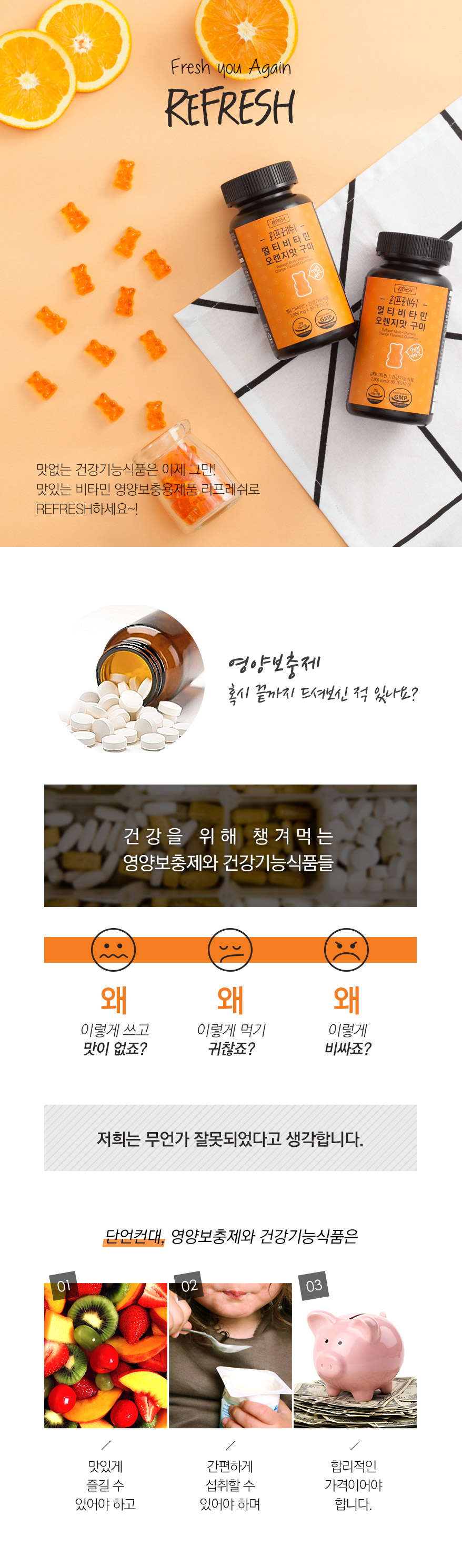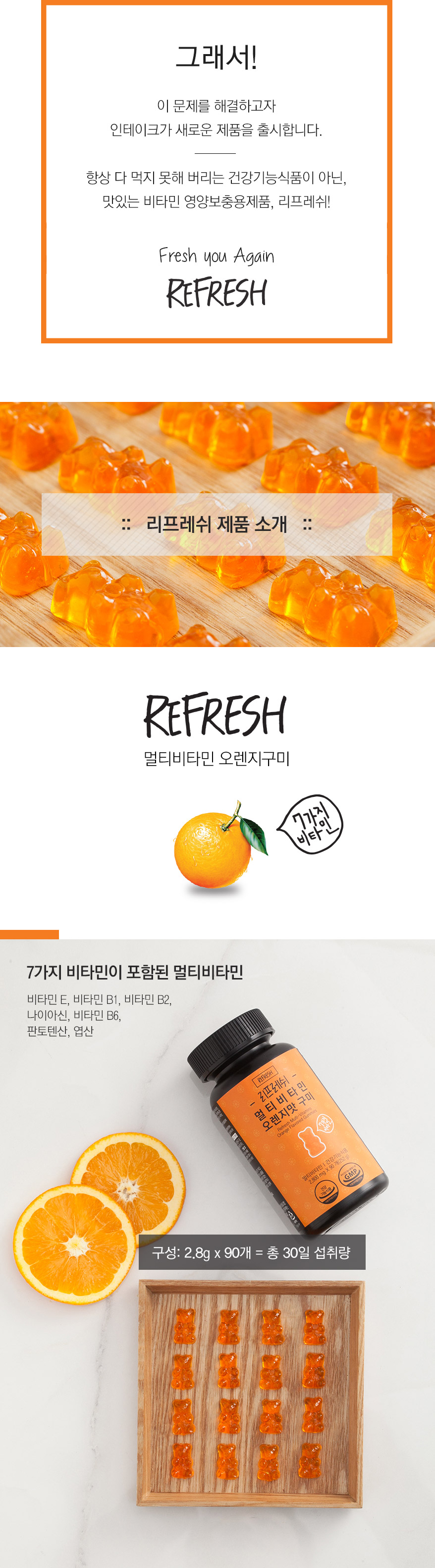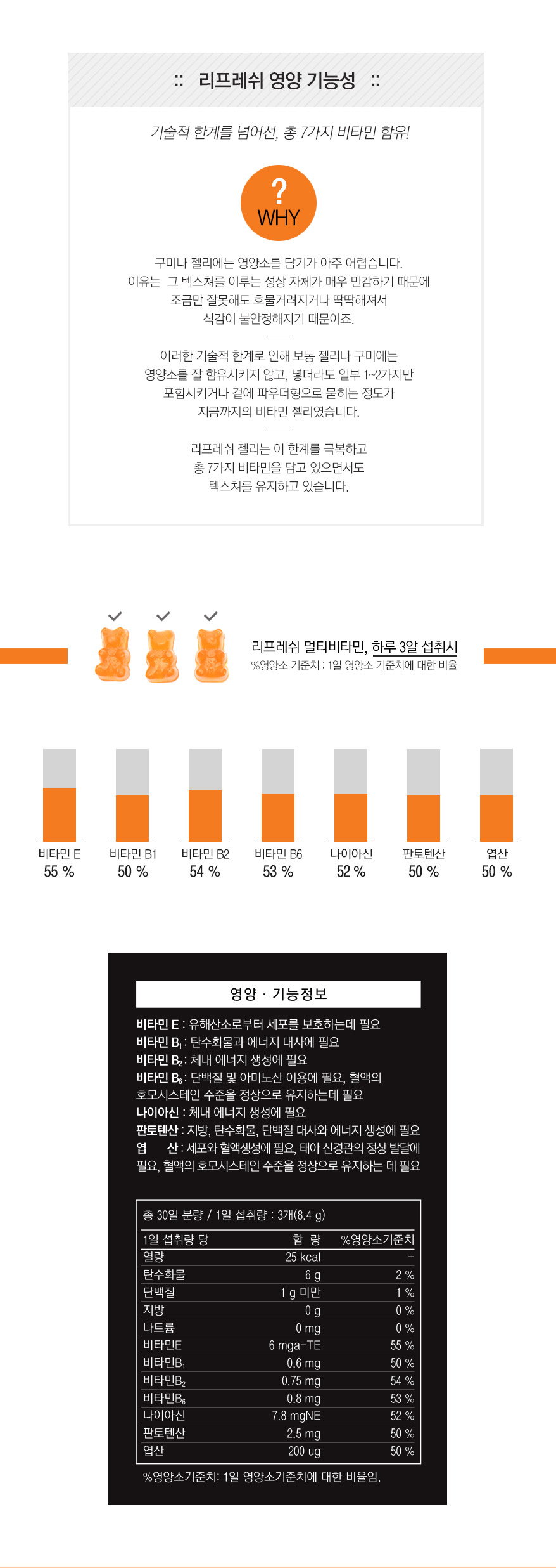 Vitamin E mixed formulation (DL- alpha-tocopheryl acetate, modified starch, dextrins, silicon dioxide), nicotinamide, calcium pantothenate, vitamin B1 nitrate, vitamin B2, vitamin B6 hydrochloride, folic acid, syrup, white sugar, gelatin (donpi), D- sorbitol solution, purified water, anhydrous citric acid, DL- malic acid, pectin, orange concentrate (Brazil), orange aroma 1 (synthetic flavoring), {keep refining process (Indonesian)} edible foods, two orange flavor (natural flavoring ), an orange pigment (mixed formulation / purified water, propylene glycol, corn syrup, safflower yellow pigment, alcohol, cochineal extract dye, and anhydrous citric acid), enzyme-treated stevia, gold complex extract {gold concentrate (Korea), licorice extract (Korean)}