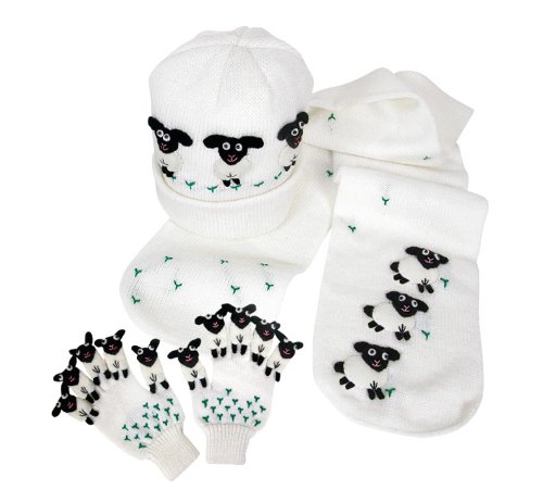-. Binding : Apparel -. Brand : Kidorable -. Department : unisex-child -. Feature : Comfortable, acrylic knitwear / Adorable little sheep stitched to fabric / Hats and scarves are one size fits most. / Size small gloves fit 3-5 years, Size medium fit 6-8 years -. ProductGroup : Apparel -. ProductTypeName : ACCESSORY -. Title : Kidorable Adorable Novelty Knit Hat, Scarf & Glove Set - Sheep