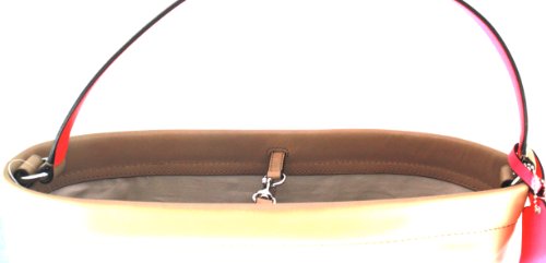 -. Feature : Approximate Measurements: 11" (L) x 13" (H) x 8" (W) Two Tone Leather Handle with 6" Drop / Brown/Sand Leather Exterior with Pink Leather Accents / Pink Leather Hang Tag with Pink Leather Tassels / Front Pocket with Turn Lock Closure; Dog Leash Top Closure; Roomy Interior / 1 Interior zipper pocket with leather pull, 2 Interior multifunctional slip pockets