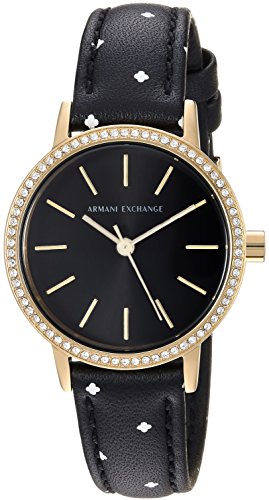Polished gold-tone indexes accent the black sunray dial of this sleek Armani Exchange ladies' watch, finished with a gold-tone case and black leather strap with white quatrefoil print.