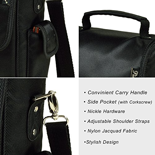 Padded center divider to keep wine bottles from clanking which can be folded back to carry larger bottles - adjustable shoulder strap and convenient carry handle