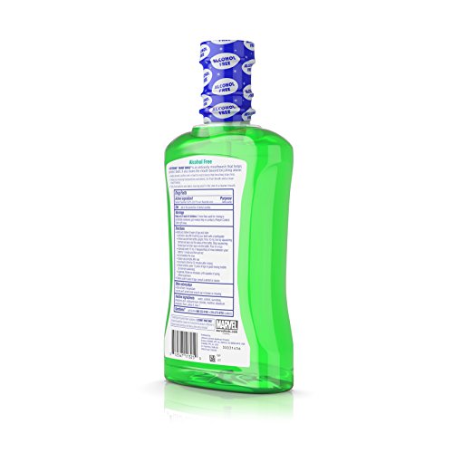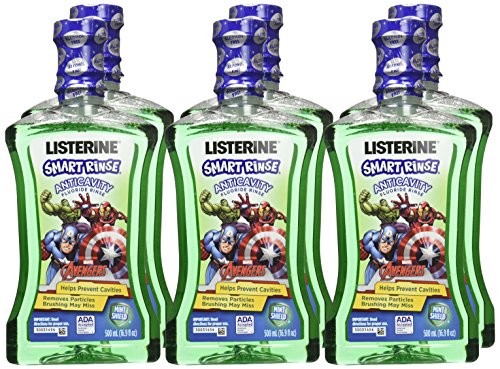 Protect your child's mouth with Listerine Smart Rinse, Marvel Avengers, Mint Shield . For kids six years and older, this alcohol-free mouthwash with fluoride is clinically shown to prevent and reduce tooth decay, and it offers 12- hour cavity protection. Listerine Smart Rinse strengthens teeth 99 percent better than brushing alone,* and cleans even in hard-to-reach places brushing may miss. It tints food particles and debris, leaving proof in the sink of a cleaner mouth. Listerine Smart Rinse is an alcohol-free fluoride mouthwash, and the sweet mint flavor and Marvel Avengers theme make it fun for kids to take care of their teeth. *Based on laboratory testing. Data on file.Feature