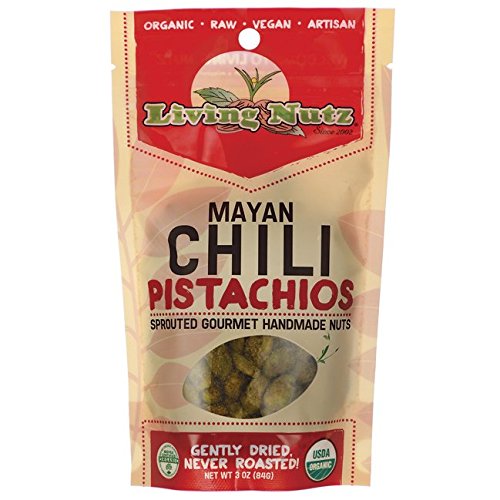 -. Binding : Health and Beauty -. Brand : Living Nutz -. EAN : 0671762102037 -. Feature : Living Nutz / Living Nutz Mayan Chili Pistachios 3 oz Pkg / Gluten Free, Vegan, Vegetarian, Organic, Non-GMO -. Label : Living Nutz -. Manufacturer : Living Nutz -. PackageQuantity : 1 -. ProductGroup : Health and Beauty -. ProductTypeName : HEALTH_PERSONAL_CARE -. Publisher : Living Nutz -. Size : 3 Ounces -. Studio : Living Nutz -. Title : Living Nutz Mayan Chili Pistachios 3 oz Pkg -. UPC : 671762102037
