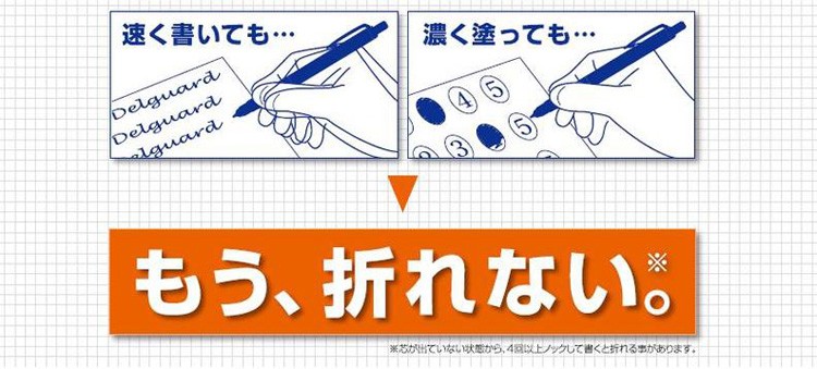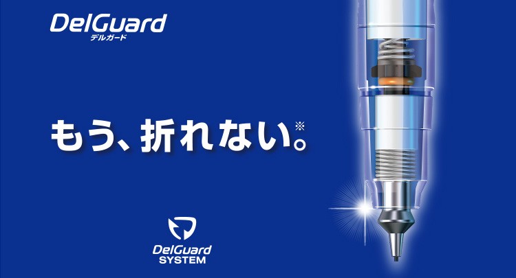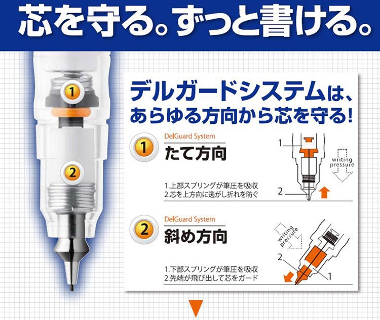 筆記中の、あらゆる角度のどんなに強い筆圧からも折れないように芯を守ります。紙面に対し、垂直に強い筆圧が加わると、軸に内蔵されたスプリングが芯を上方向に逃し折れを防ぎます。斜めに強い筆圧が加わると、先端の金属部品が自動で出てきて芯を包み込みガードします。その二つの機構が、加わる力の角度や強さに合わせて自動で配分を調整して作動します。 軸内部にシャープ芯を誘導する部品を取り付けたことで、短い芯でもずれてつまることがありません。