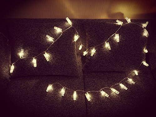 30 clear mini clothespins clip for photos. Each clip contains an LED that emits gorgeous warm white light