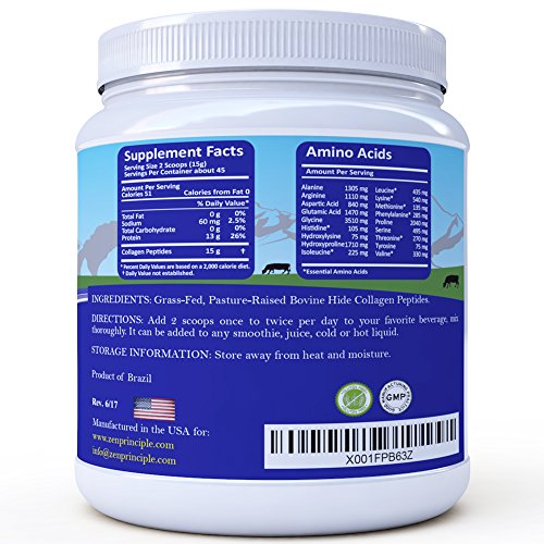 Studio : Zen Principle Publisher : Zen Principle Binding : Health and Beauty Product Description WHY USE BEEF COLLAGEN POWDER? ? An Essential Part of Your Healthy Diet. Hydrolzyed Collagen Peptides are short chain amino acids which are 'cell-ready' (easily digested) and easy to mix into cold and warm drinks. Peptides are crucial to maintaining healthy skin, hair, nails, joints and bones. ? Much More Effective Than Collagen Creams. Collagen powder taken as part of your healthy diet is far superior to topical creams or gels. Creams promise only a temporary cosmetic fix while increasing collagen in your diet will help the body from within, where it can provide real benefits. WHY BUY FROM ZEN PRINCIPLE? ? We Source Only the Best Quality Bovine Peptides. Unlike other sellers, we use only grass-fed, pasture-raised cows from the nutrient-rich grasslands of South America. The cows are humanely raised and are free of harmful antibiotics, GMO-contaminated feed, artificial additives, etc. Our beef collagen is produced under strict quality and health guidelines and tested multiple times to ensure purity. ? FREE scoop included! Use our included scoop to make it easier to measure the amount you want to use and also reduce spilling or mess. ? 100% Money Back Guarantee. We want you to be happy with our bovine collagen peptides. If you are not for any reason, we'll gladly give you a full refund within 30 days. 0 |